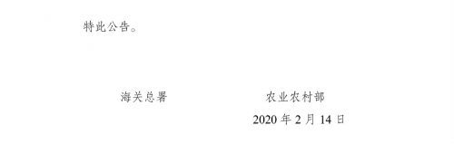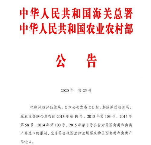 2019年11月14日,海關(guān)總署與與農(nóng)業(yè)農(nóng)村部聯(lián)合發(fā)布2019年第177號(hào)公告,宣布自本公告發(fā)布之日起,解除原質(zhì)檢總局、原農(nóng)業(yè)部聯(lián)合發(fā)布的2013年第19號(hào)、2013年第103號(hào)、2014年第58號(hào)、2014年第100號(hào)和2015年第8號(hào)公告有關(guān)美國禽肉進(jìn)口的限制,允許符合我國法律法規(guī)要求的美國禽肉進(jìn)口。2019年11月22日和12月25日,海關(guān)總署又先后對(duì)外公布了美國172、177家禽肉企業(yè)的對(duì)華出口資質(zhì),發(fā)布了允許對(duì)華出口禽肉產(chǎn)品名單。2月14日,海關(guān)總署與農(nóng)業(yè)農(nóng)村部聯(lián)合發(fā)布2020年第25號(hào)公告,重申了2019年第177號(hào)公告的相關(guān)內(nèi)容。